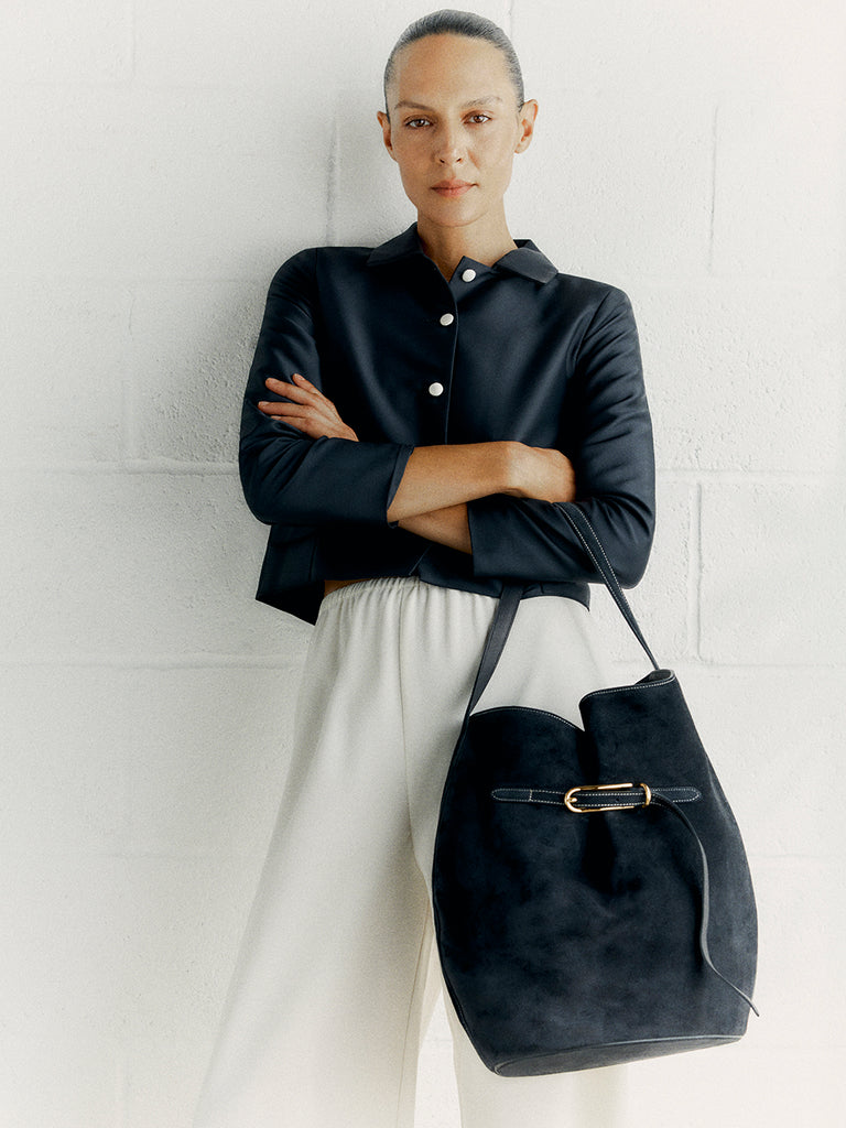 Timeless aesthetic seamlessly merges with modern practicality in the Belted Bucket Bag. Its curved shape, inspired by organic silhouettes found in nature, is cinched with a slender buckle. Perfectly sized to fit a 13” laptop, among other essentials, it’s the ideal pick for workdays in the city.