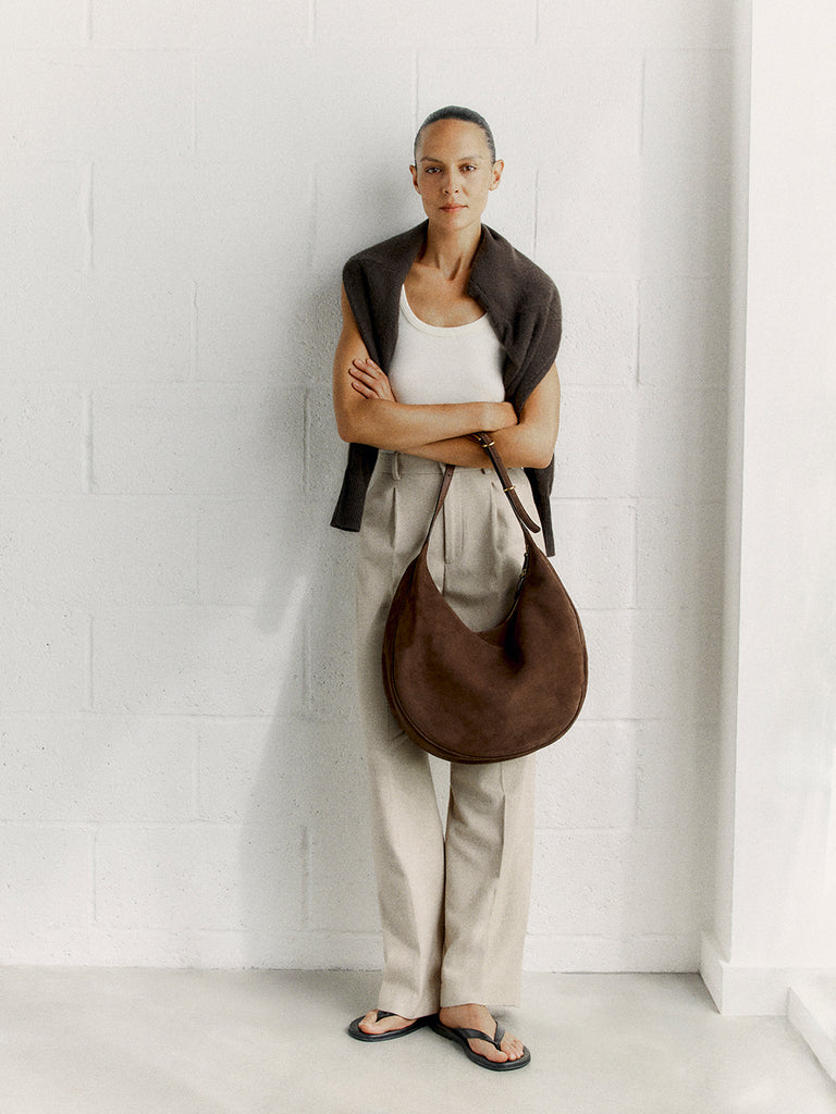 Deceptively spacious - it fits a laptop - our Moon Hobo is the new take on a work week essential. Its crescent silhouette comes in suede or new vintage effect leather that's been treated for a well-loved effect. A zipper keeps all items secure and a slender buckle on the handle adds a touch of glamour. Carry it on the shoulder or cross body.
