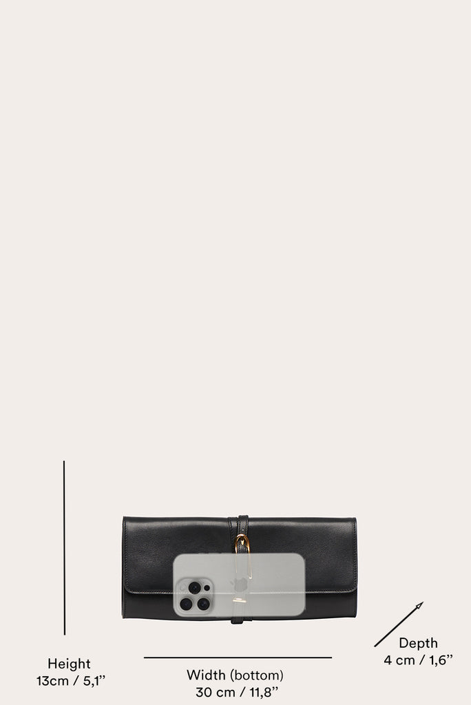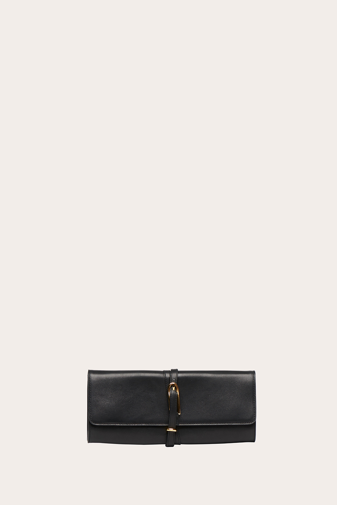 Sleek and compact, this chic clutch features a double-wrapped belted fastening and signature buckle. Perfectly sized for the essentials, it is the ideal pick for gallery strolls, coffee dates and evening outings.